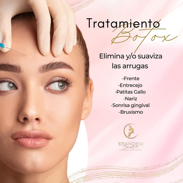La toxina botulínica, conocida comúnmente como Botox, es uno de los tratamientos más efectivos y seguros para prevenir y suavizar arrugas de expresión. En ERANDENI SKIN ART lo aplicamos con precisión médica y estética, logrando un resultado natural, sin perder la frescura ni la expresión del rostro.